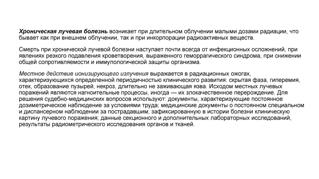 Хроническая лучевая болезнь возникает при длительном облучении малыми дозами радиации, чтобывает как при внешнем облучении, так и при инкорпорации радиоактивных веществ.