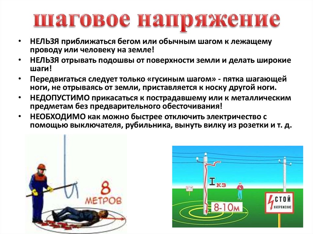 • НЕЛЬЗЯ приближаться бегом или обычным шагом к лежащемупроводу или человеку на земле!