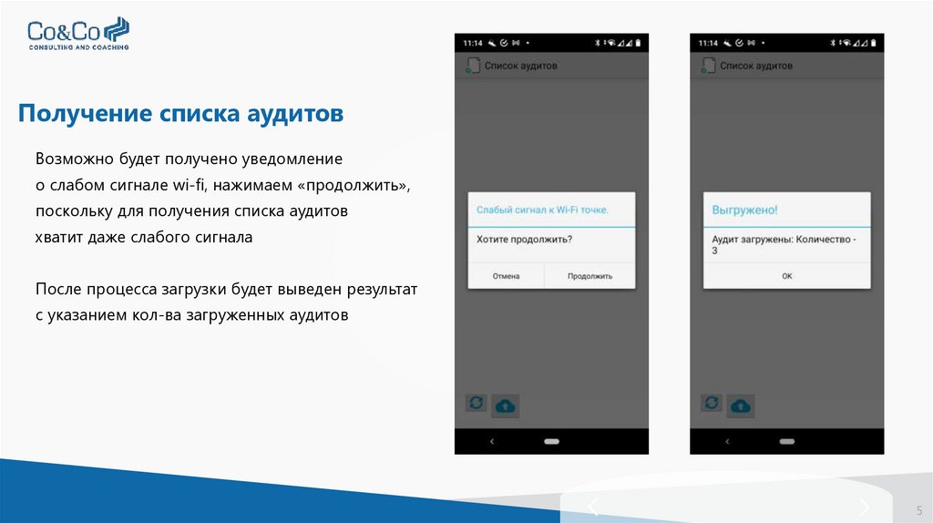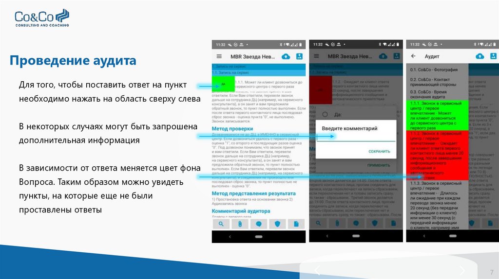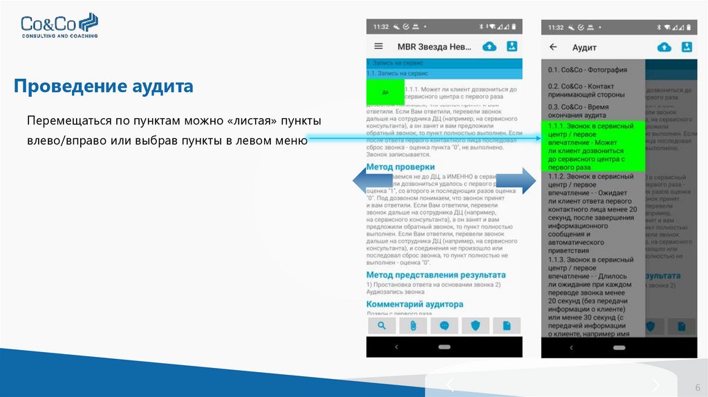 Проведение аудитаПеремещаться по пунктам можно «листая» пункты