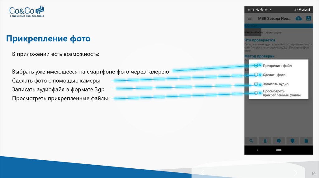 Прикрепление фотоВ приложении есть возможность: