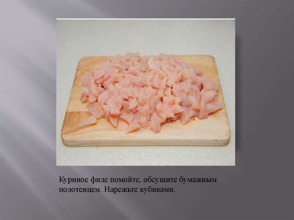 Куриное филе помойте, обсушите бумажнымполотенцем. Нарежьте кубиками.