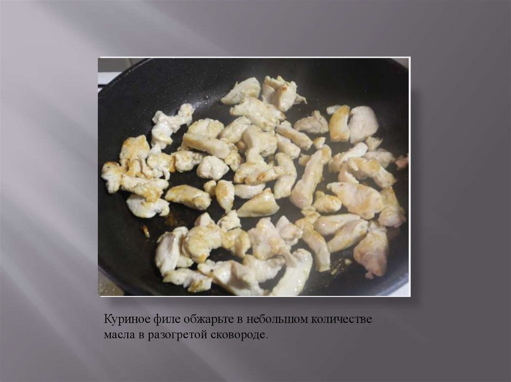Куриное филе обжарьте в небольшом количествемасла в разогретой сковороде.