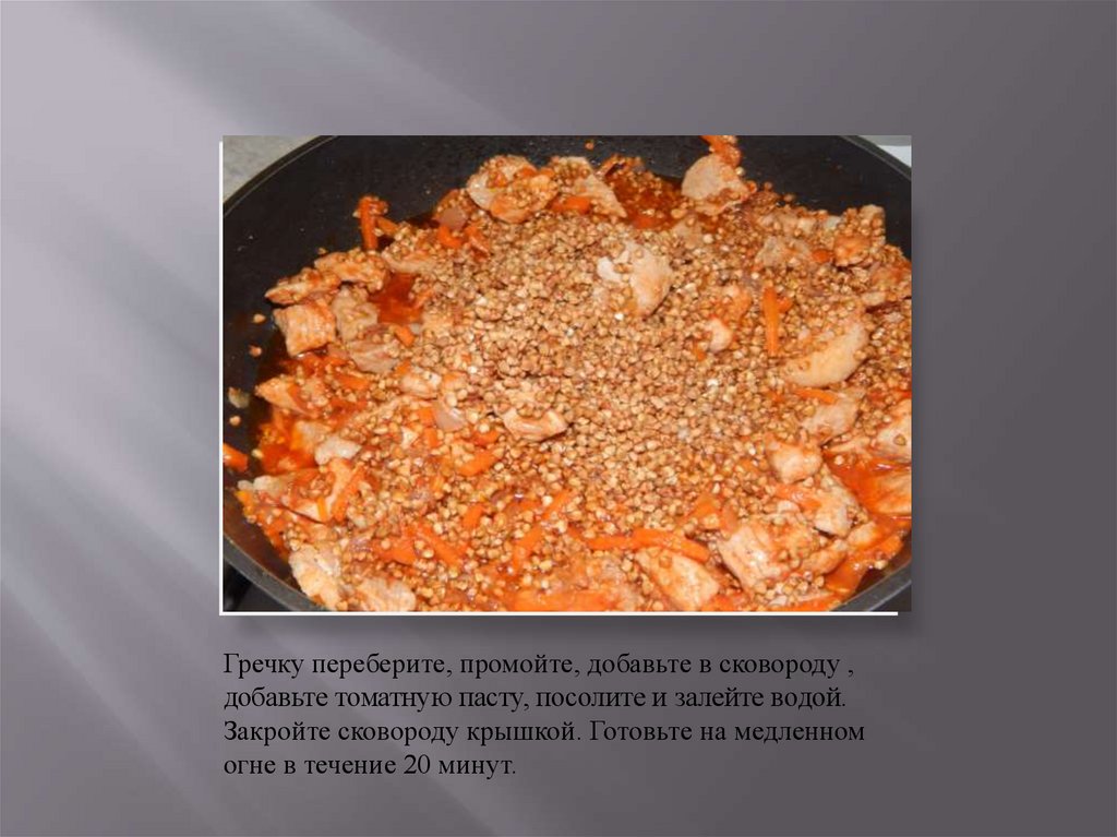 Гречку переберите, промойте, добавьте в сковороду ,добавьте томатную пасту, посолите и залейте водой.