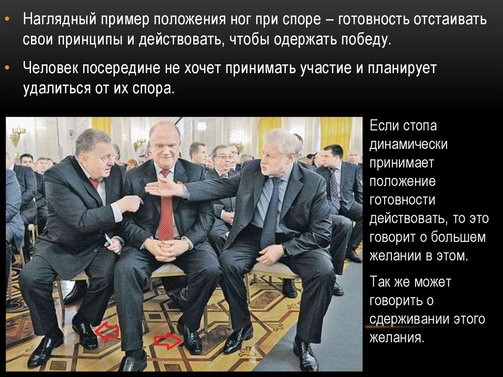 • Наглядный пример положения ног при споре – готовность отстаиватьсвои принципы и действовать, чтобы одержать победу.