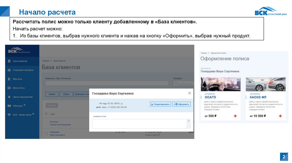 Начало расчетаРассчитать полис можно только клиенту добавленному в «База клиентов».