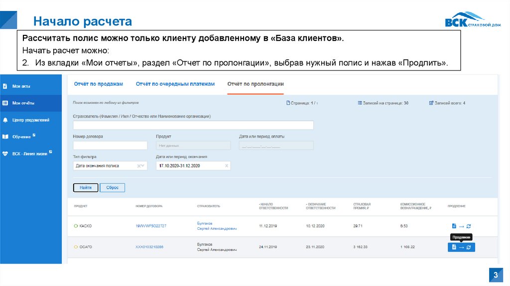 2. Из вкладки «Мои отчеты», раздел «Отчет по пролонгации», выбрав нужный полис и нажав «Продлить».