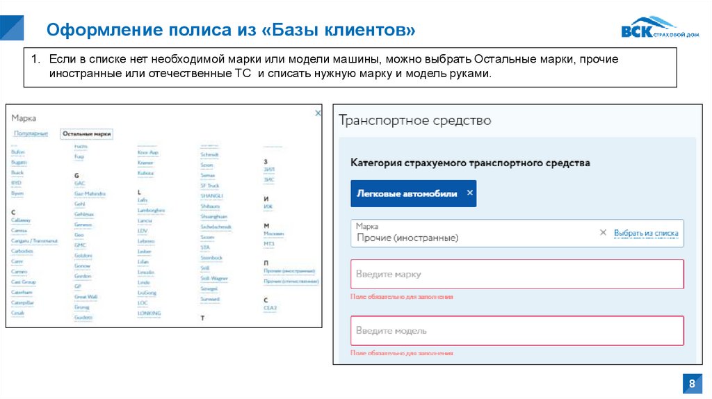 Оформление полиса из «Базы клиентов»1. Если в списке нет необходимой марки или модели машины, можно выбрать Остальные марки, прочие