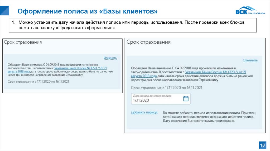 Оформление полиса из «Базы клиентов»1. Можно установить дату начала действия полиса или периоды использования. После проверки всех блоков