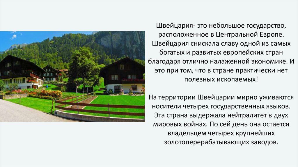 Швейцария- это небольшое государство,расположенное в Центральной Европе.