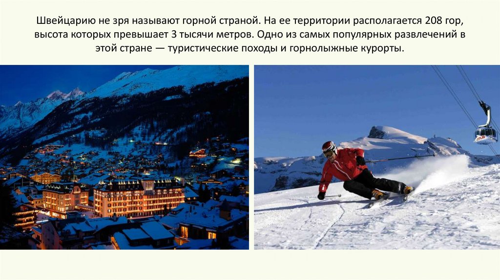 Швейцарию не зря называют горной страной. На ее территории располагается 208 гор,высота которых превышает 3 тысячи метров. Одно из самых популярных развлечений в