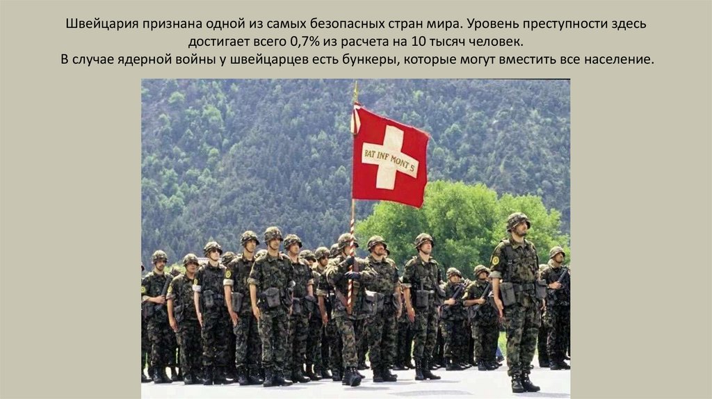 Швейцария признана одной из самых безопасных стран мира. Уровень преступности здесьдостигает всего 0,7% из расчета на 10 тысяч человек.