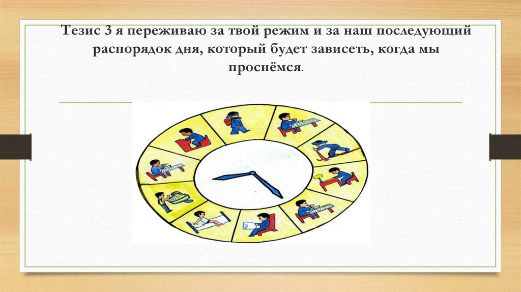 Тезис 3 я переживаю за твой режим и за наш последующийраспорядок дня, который будет зависеть, когда мы