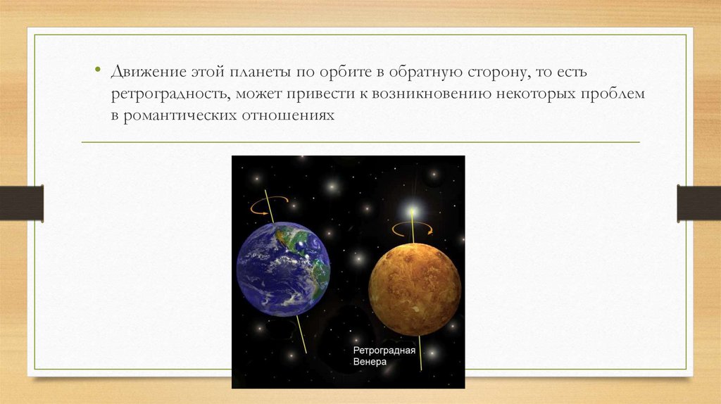• Движение этой планеты по орбите в обратную сторону, то естьретроградность, может привести к возникновению некоторых проблем