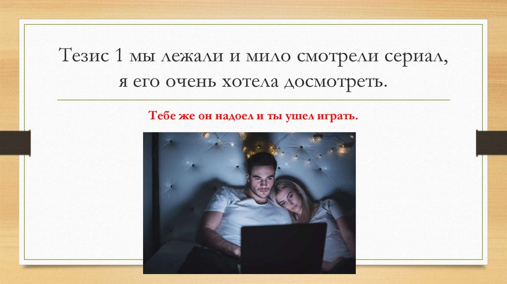 Тезис 1 мы лежали и мило смотрели сериал,я его очень хотела досмотреть.