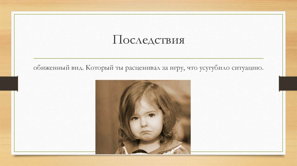 Последствияобиженный вид. Который ты расценивал за игру, что усугубило ситуацию.