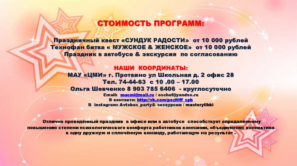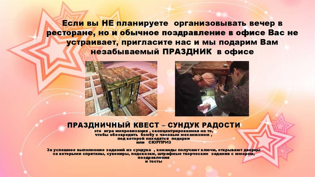 СТОИМОСТЬ ПРОГРАММ:Праздничный квест «СУНДУК РАДОСТИ» от 10 000 рублей