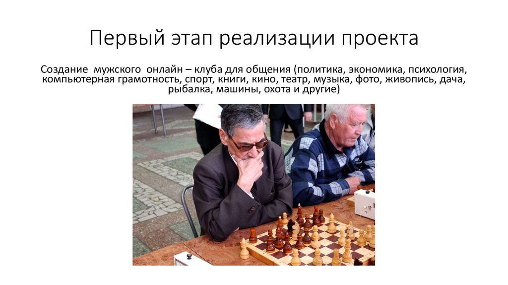 Первый этап реализации проектаСоздание мужского онлайн – клуба для общения (политика, экономика, психология,