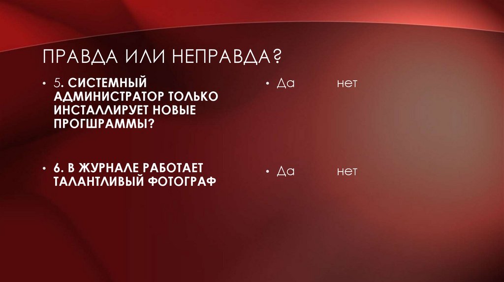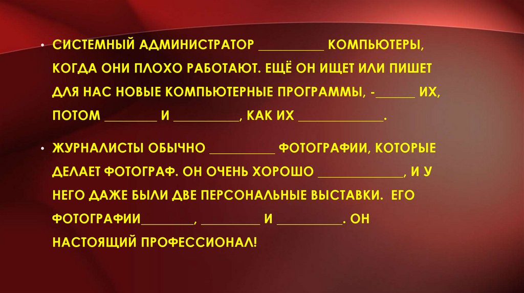 • СИСТЕМНЫЙ АДМИНИСТРАТОР __________ КОМПЬЮТЕРЫ,КОГДА ОНИ ПЛОХО РАБОТАЮТ. ЕЩЁ ОН ИЩЕТ ИЛИ ПИШЕТ