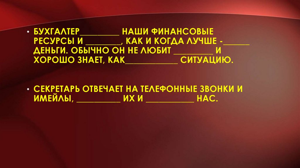 • БУХГАЛТЕР_________ НАШИ ФИНАНСОВЫЕРЕСУРСЫ И ________, КАК И КОГДА ЛУЧШЕ -______
