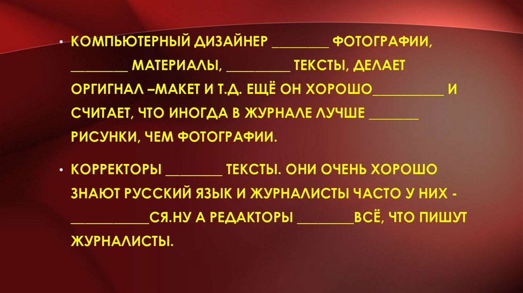 • КОМПЬЮТЕРНЫЙ ДИЗАЙНЕР ________ ФОТОГРАФИИ,________ МАТЕРИАЛЫ, _________ ТЕКСТЫ, ДЕЛАЕТ