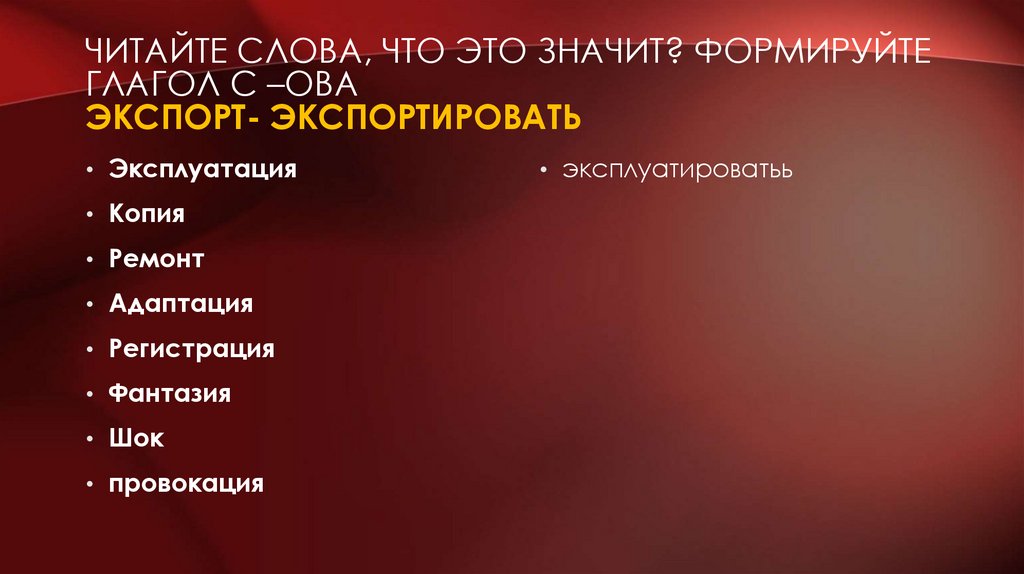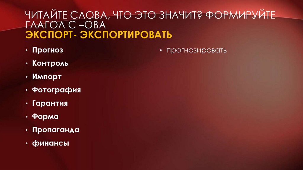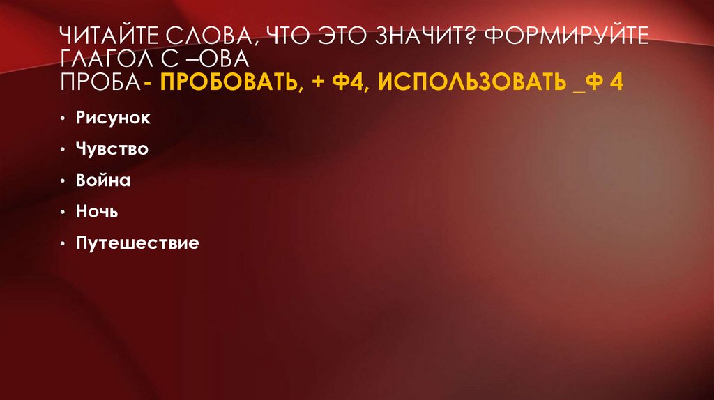 ЧИТАЙТЕ СЛОВА, ЧТО ЭТО ЗНАЧИТ? ФОРМИРУЙТЕГЛАГОЛ С –ОВА