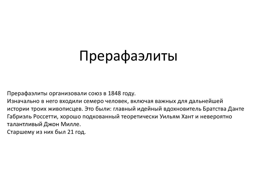 ПрерафаэлитыПрерафаэлиты организовали союз в 1848 году.