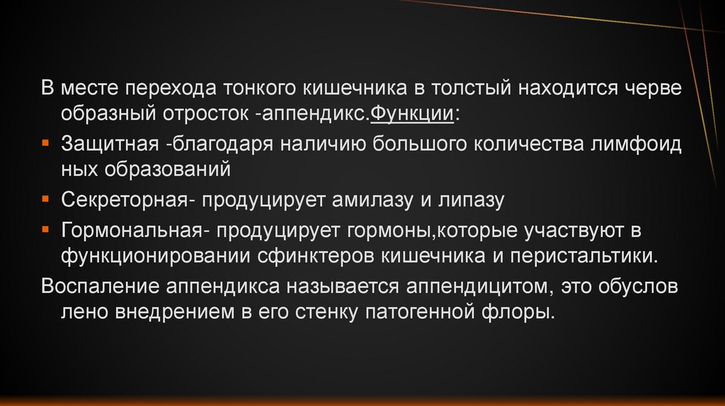 В месте перехода тонкого кишечника в толстый находится червеобразный отросток -аппендикс.Функции: