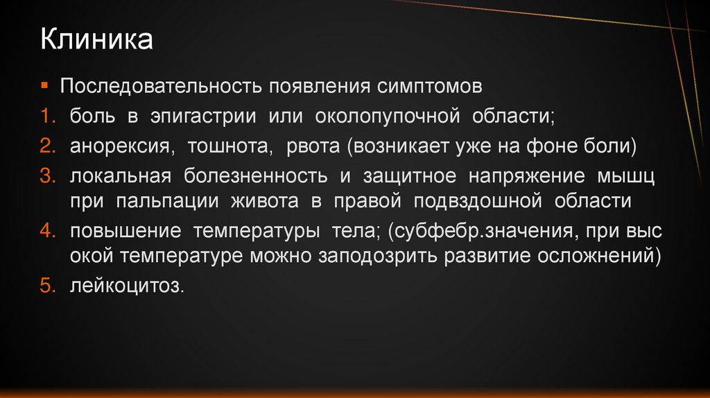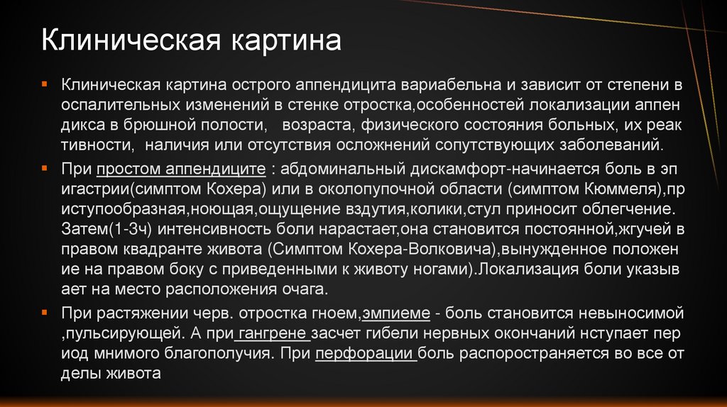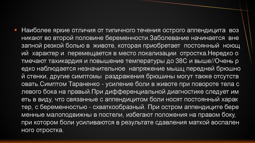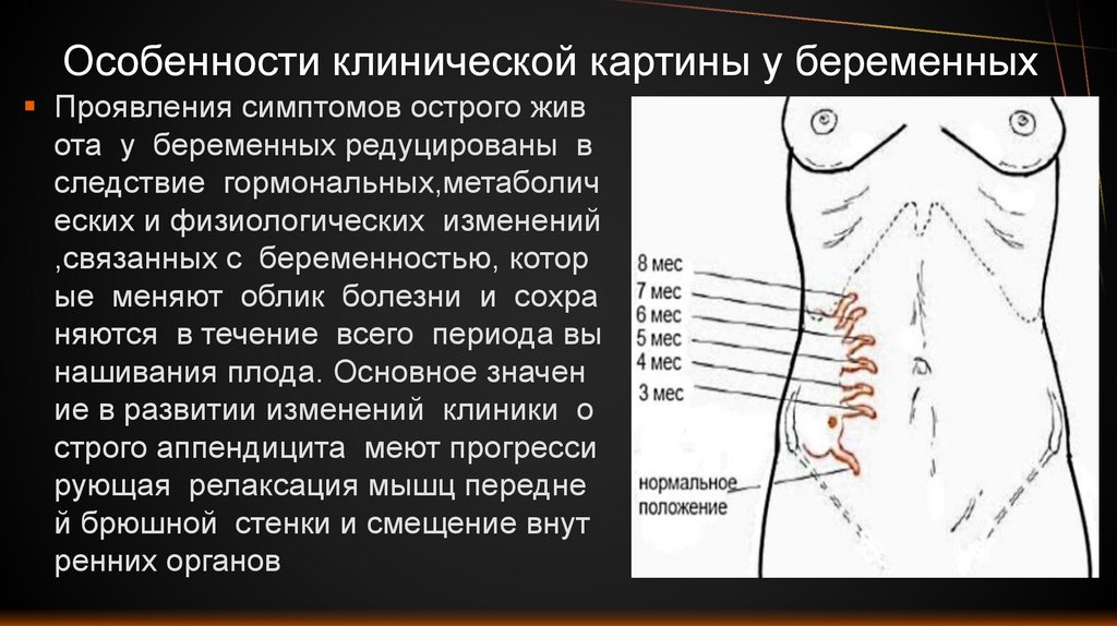 Наиболее яркие отличия от типичного течения острого аппендицита возникают во второй половине беременности.Заболевание начинается вне
