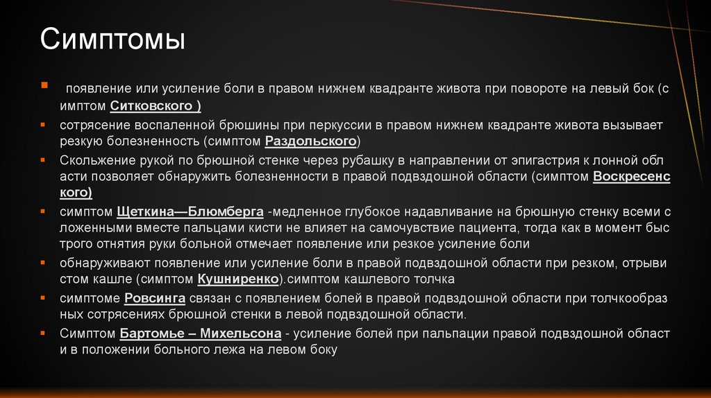 Симптомыпоявление или усиление боли в правом нижнем квадранте живота при повороте на левый бок (с