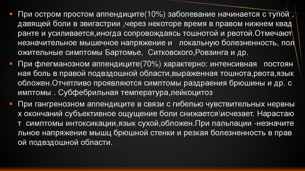 При остром простом аппендиците(10%) заболевание начинается с тупой ,давящей боли в эвигастрии ,через некоторе время в правом нижнем квад