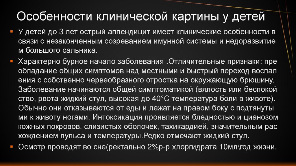 Особенности клинической картины у детейУ детей до 3 лет острый аппендицит имеет клинические особенности в
