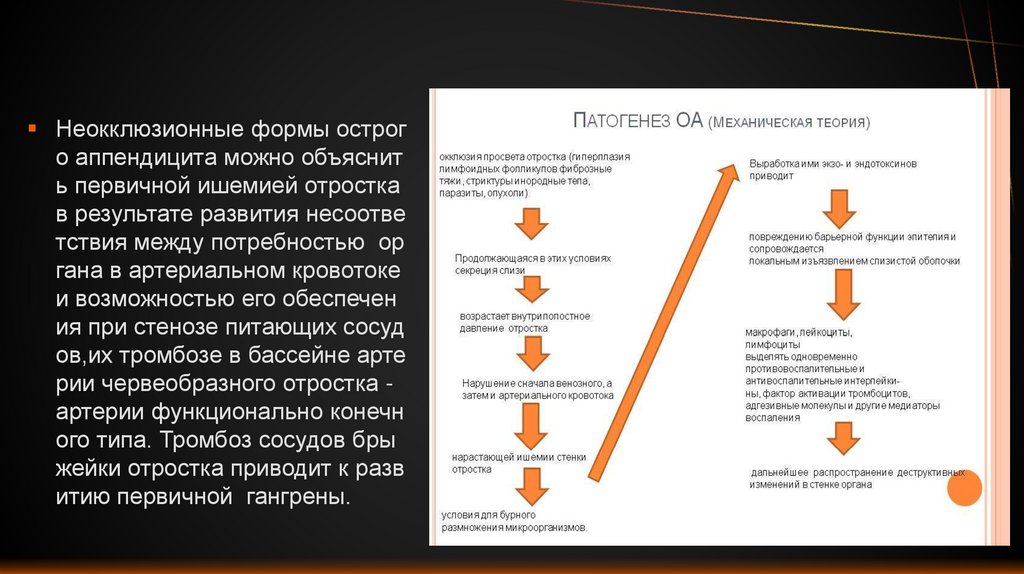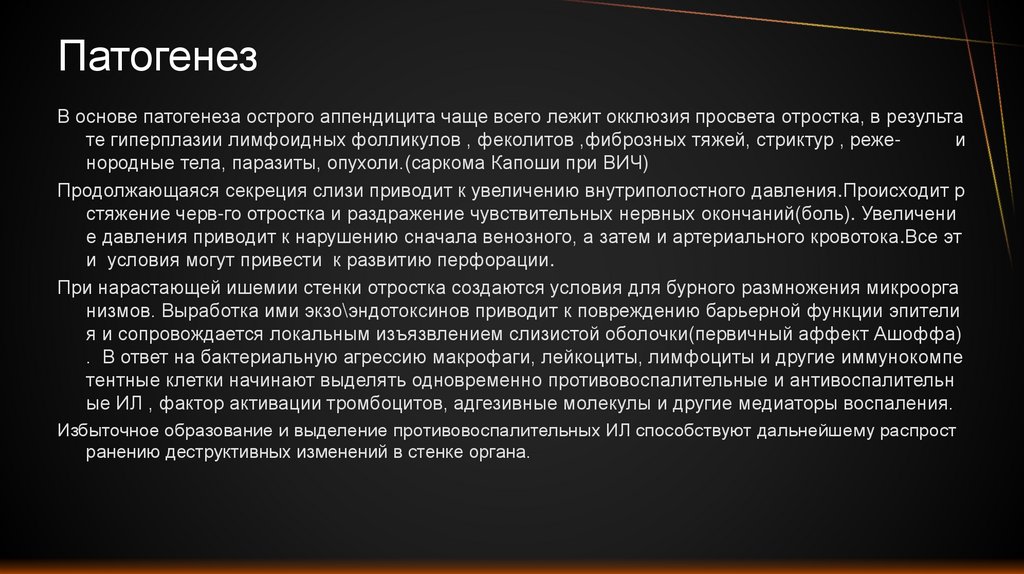 ПатогенезВ основе патогенеза острого аппендицита чаще всего лежит окклюзия просвета отростка, в результа