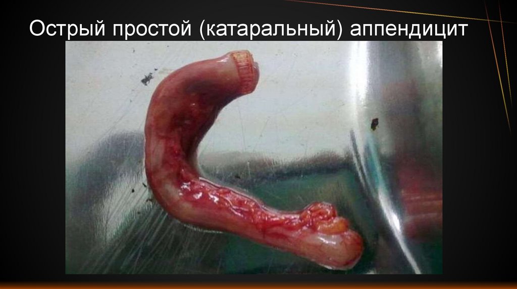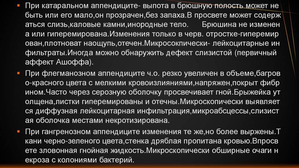 При катаральном аппендиците- выпота в брюшную полость может небыть или его мало,он прозрачен,без запаха.В просвете может содерж