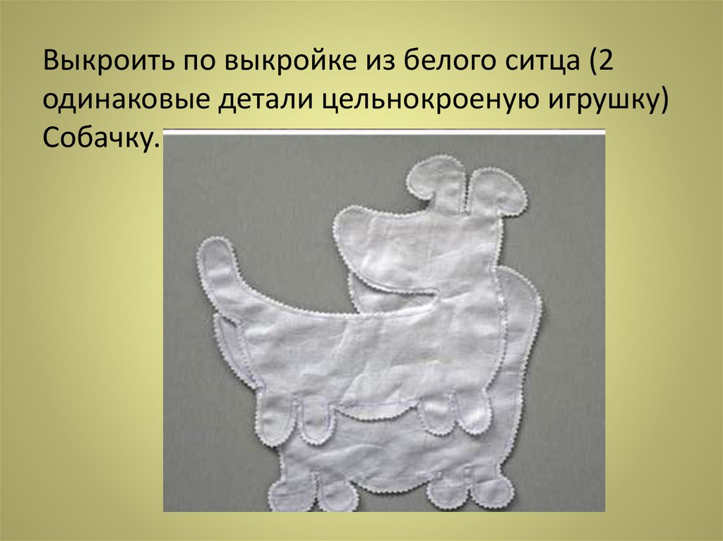 Выкроить по выкройке из белого ситца (2одинаковые детали цельнокроеную игрушку)