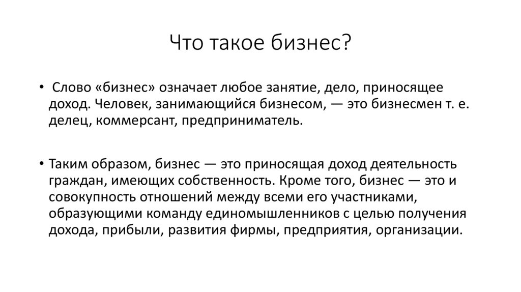 Что такое бизнес?• Слово «бизнес» означает любое занятие, дело, приносящее