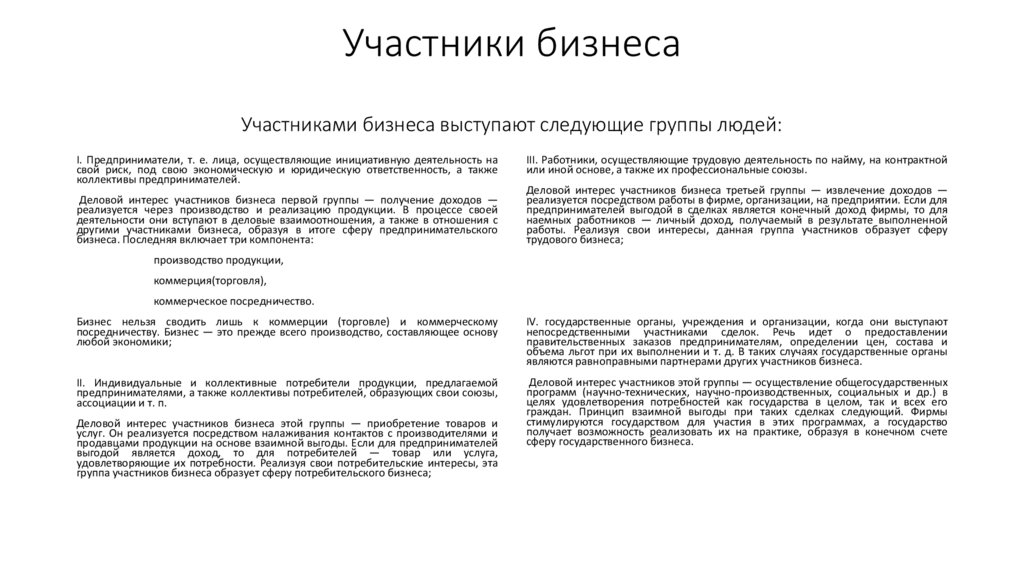 Участники бизнесаУчастниками бизнеса выступают следующие группы людей: