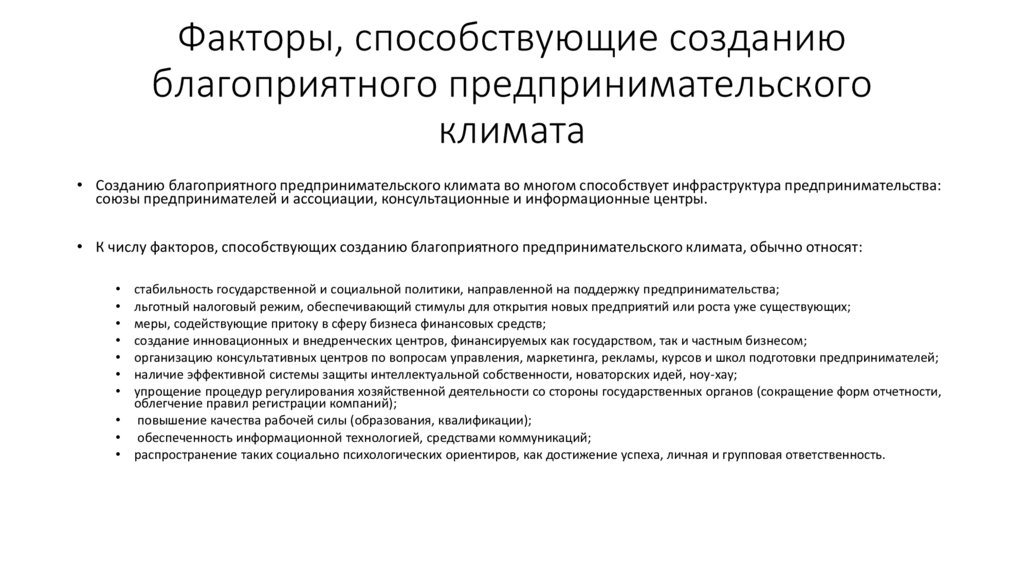 Факторы, способствующие созданиюблагоприятного предпринимательского