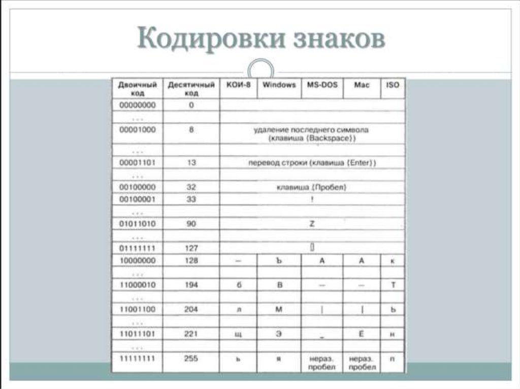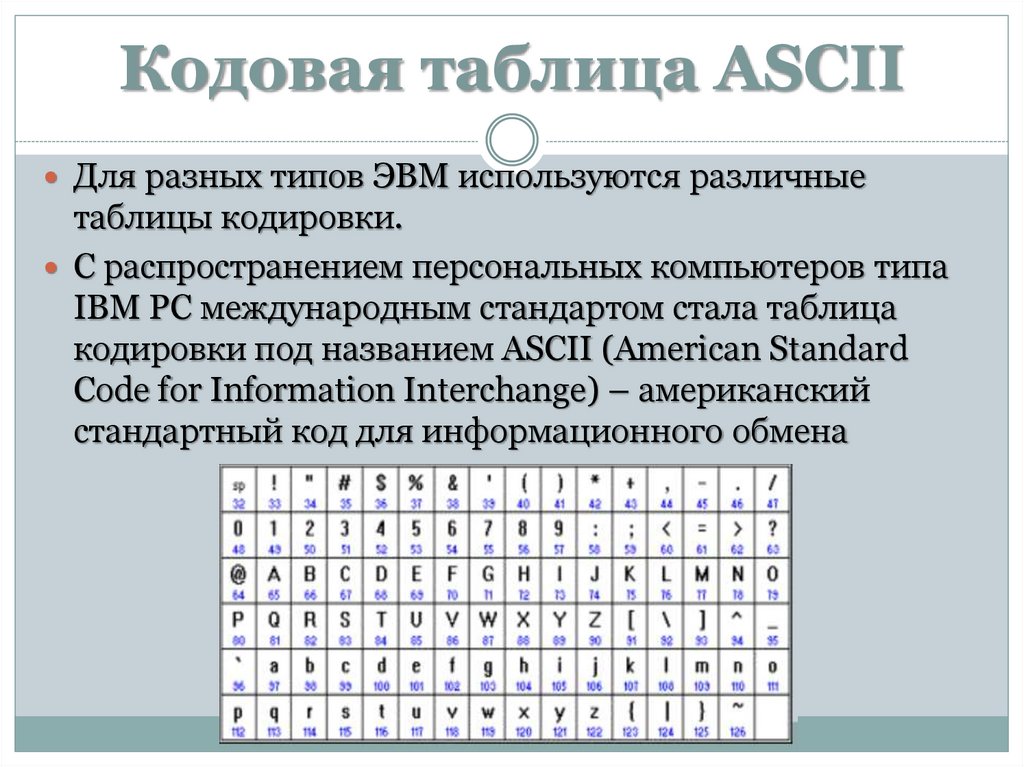 Кодовая таблица ASCIIДля разных типов ЭВМ используются различные