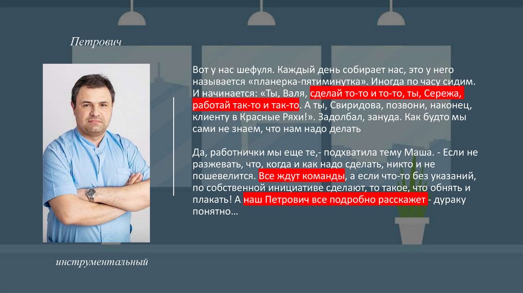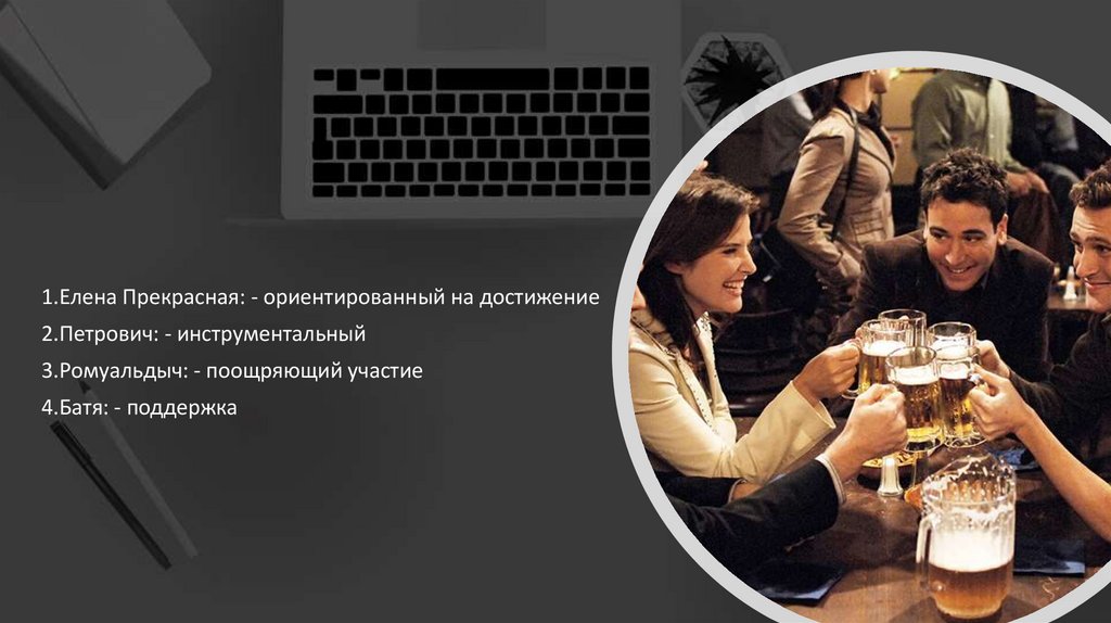1.Елена Прекрасная: - ориентированный на достижение2.Петрович: - инструментальный