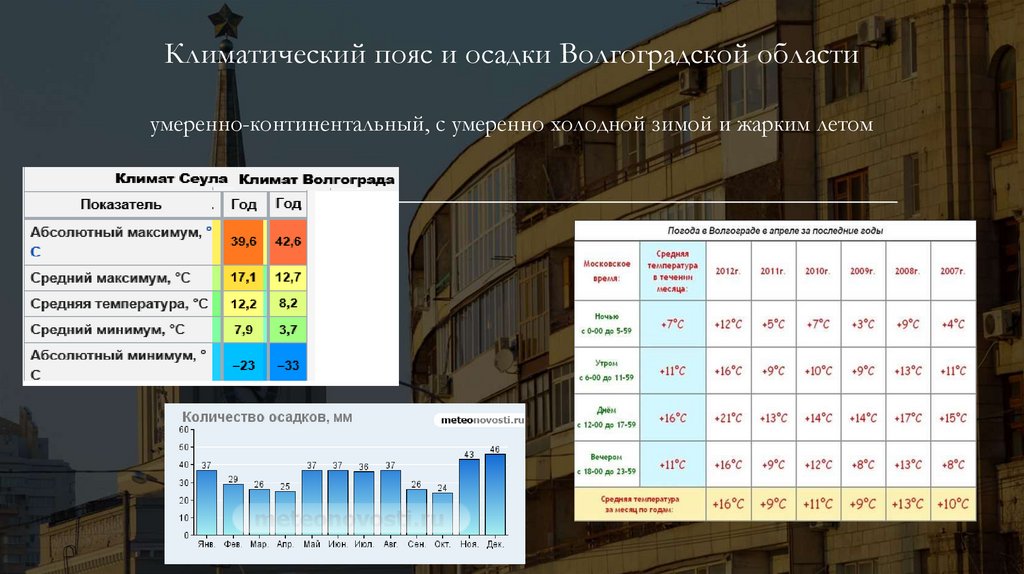 Климатический пояс и осадки Волгоградской областиумеренно-континентальный, с умеренно холодной зимой и жарким летом