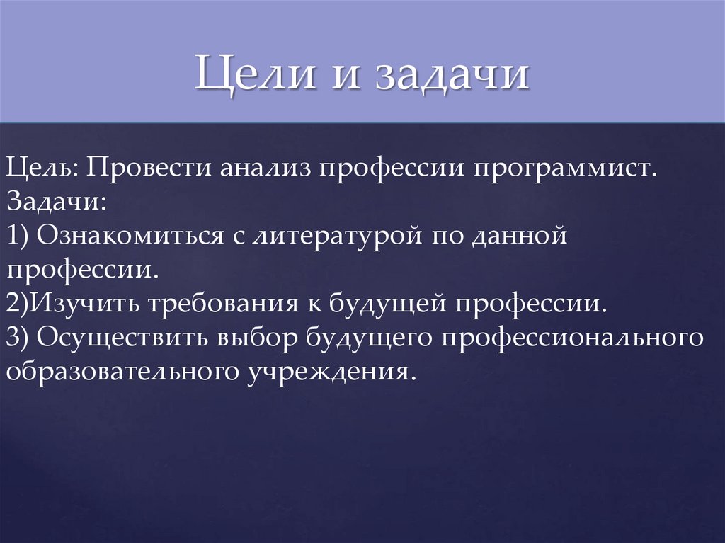 Цели и задачиЦель: Провести анализ профессии программист.