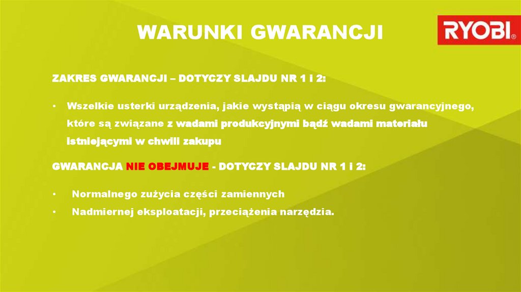 WARUNKI GWARANCJIZAKRES GWARANCJI – DOTYCZY SLAJDU NR 1 i 2: