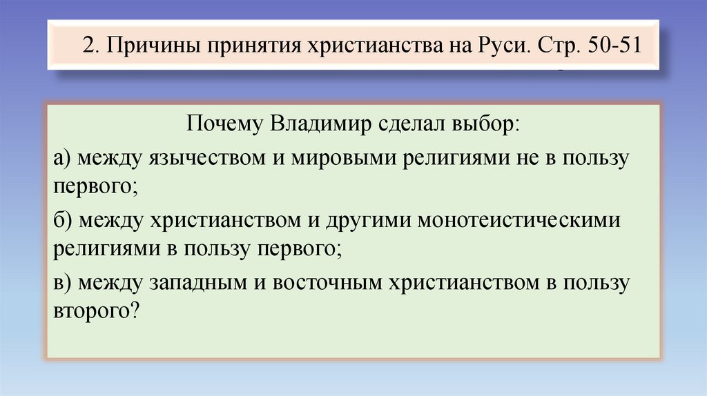 2. Причины принятия христианства на Руси.2. Причины принятия христианства на Руси. Стр. 50-51
