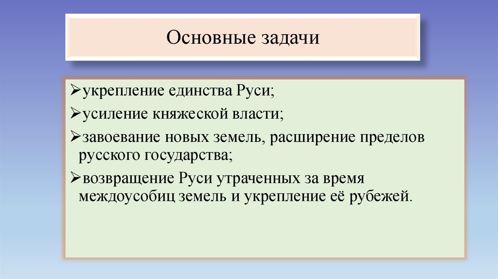 Основные задачиукрепление единства Руси;