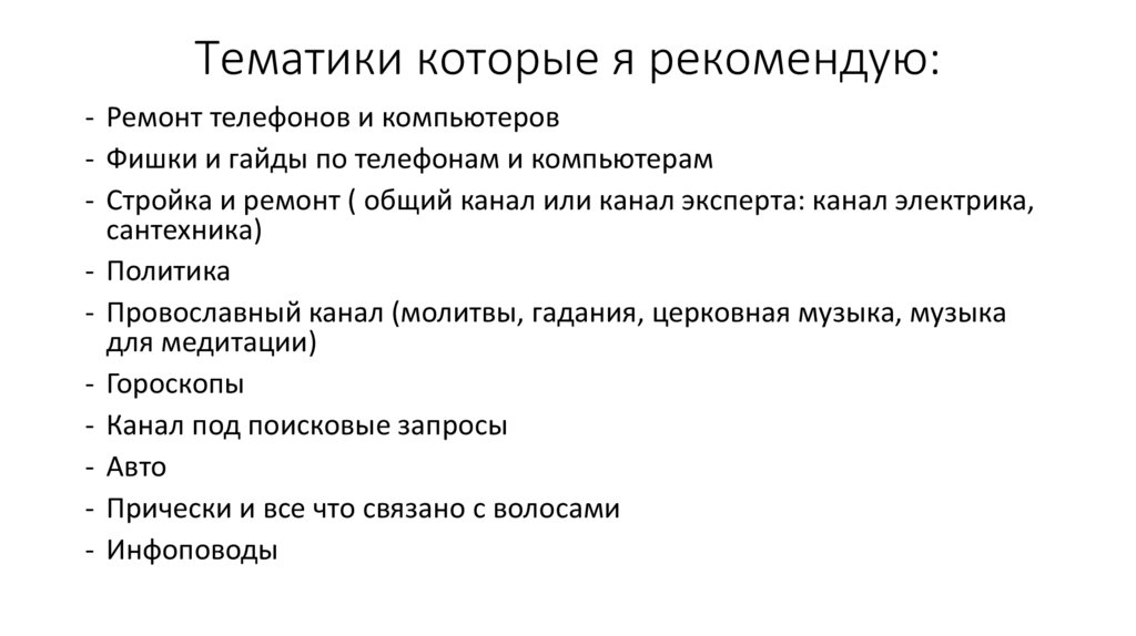 Тематики которые я рекомендую:- Спортивный канал ( тренировки в домашних условиях, ПП,