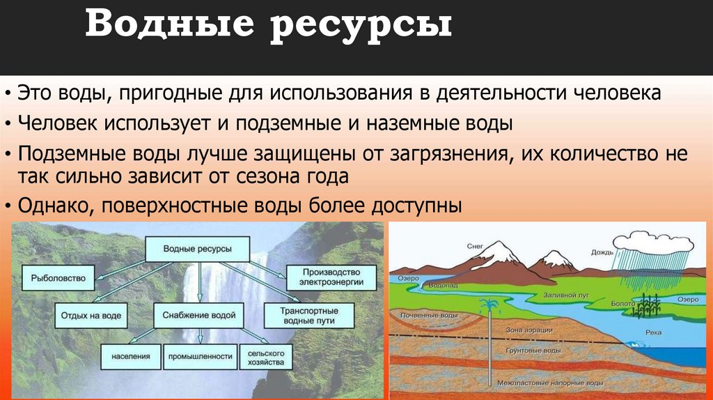Водные ресурсы• Это воды, пригодные для использования в деятельности человека