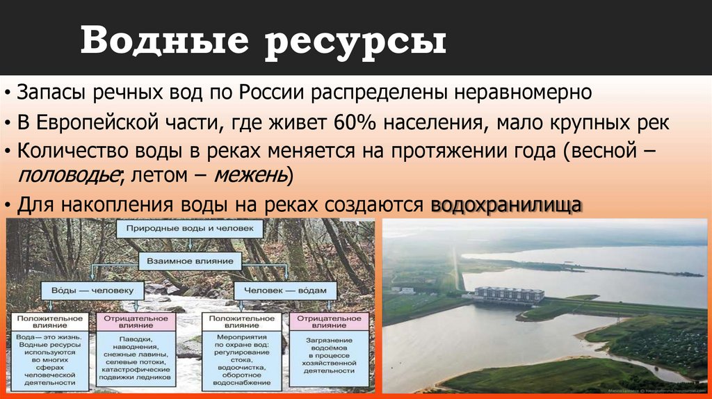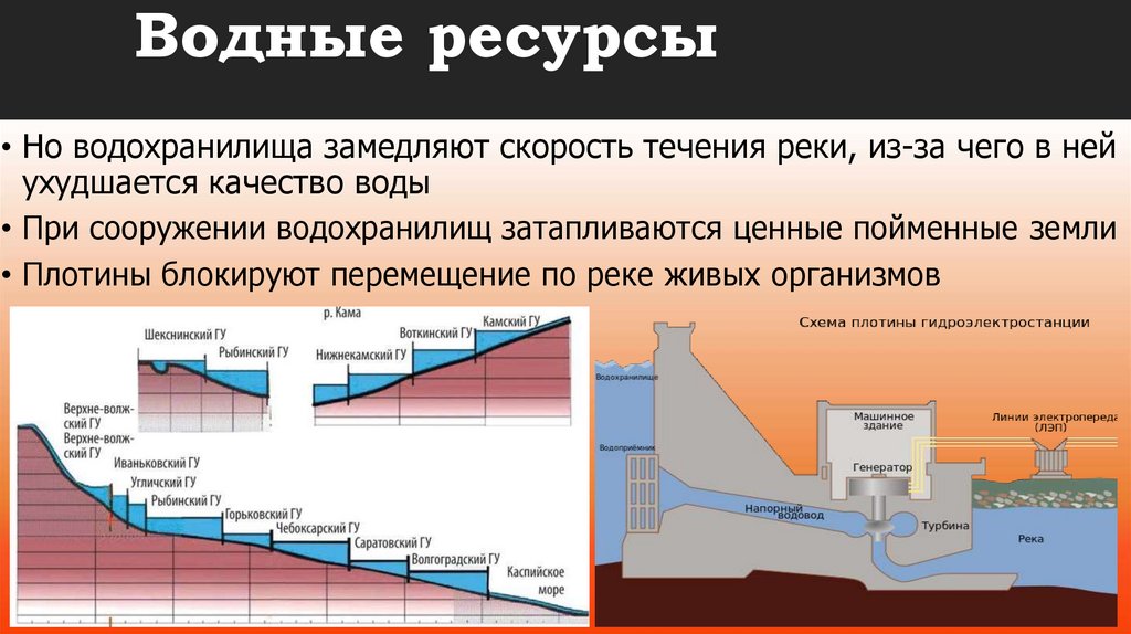 Водные ресурсы• Но водохранилища замедляют скорость течения реки, из-за чего в ней