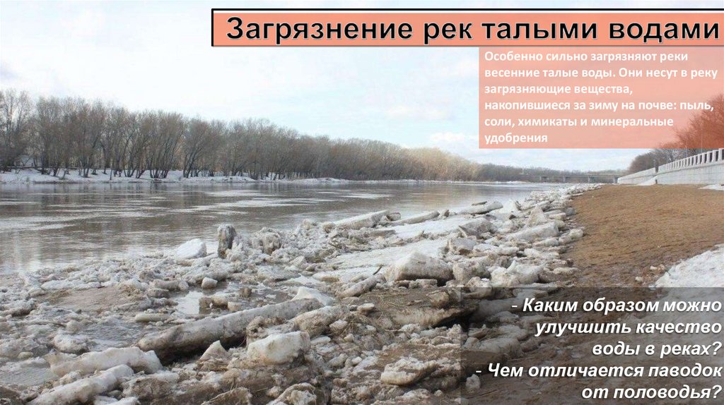 Особенно сильно загрязняют рекивесенние талые воды. Они несут в реку