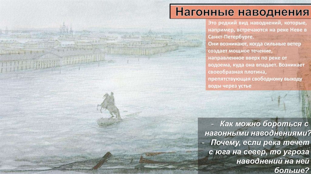 • На некоторых реках (Нева) случаются нагонные наводнения