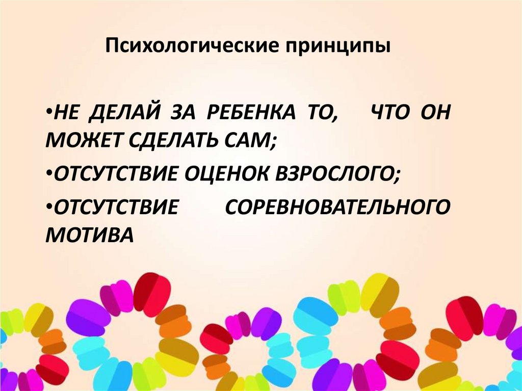 Психологические принципы•НЕ ДЕЛАЙ ЗА РЕБЕНКА ТО, ЧТО ОН
